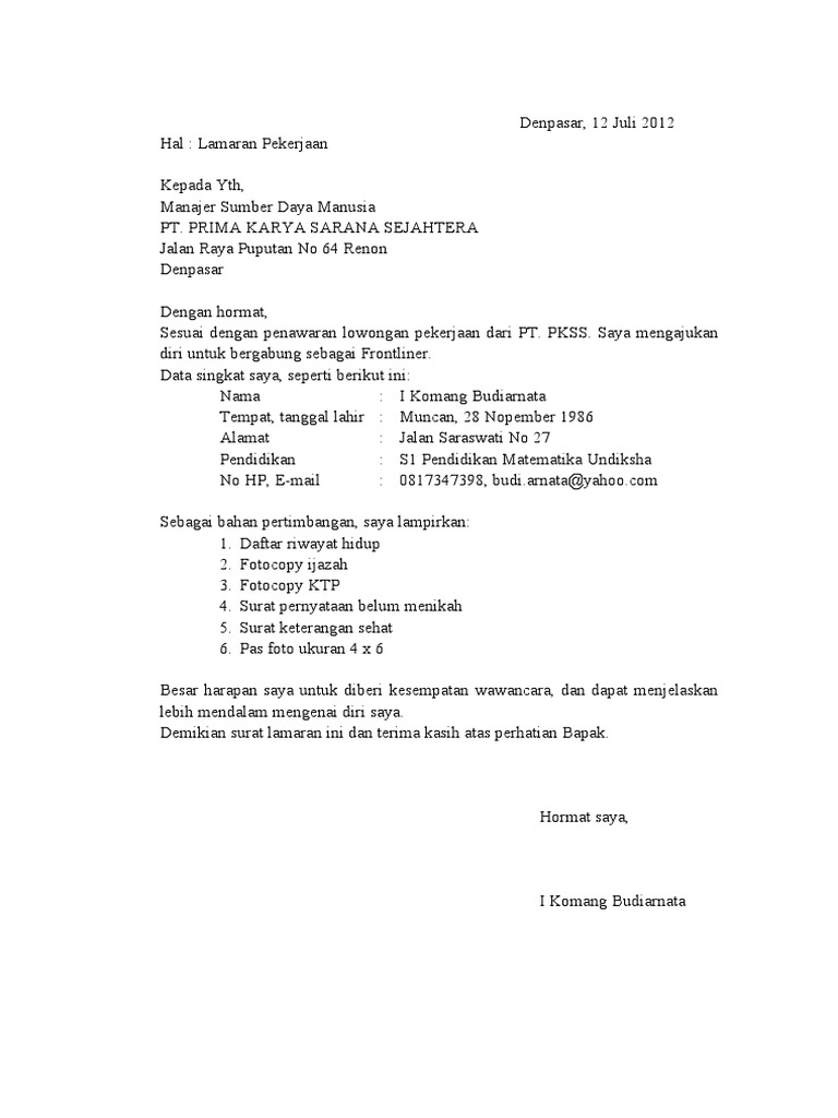 Berikut lowongan kerja pt prima karya sarana sejahtera yang bersumber dari laman karir resminya pt pkss, simak dibawah ini Coba melamar dengan memperhatikan kualifikasinya berikut. Agar bisa melamar kerja secara online dan mengisi aplikasi lowongan kerja, anda membutuhkan akun email, akses internet, cv terbaru, cover letter (jika diminta), daftar riwayat hidup dan juga jadwal kosong anda seandainya anda melamar untuk pekerjaan paruh waktu. Sebagai………… bersama ini, sebagai bahan pertimbangan saya lampirkan daftar riwayat hidup dan data pendukung lainnya. Saat ini pt pkss sedang membuka lapangan berkarir untuk posisi frontliner. Untuk tutorial cara membuat file lampiran pdf sebenarnya mudah saja, saya asumsikan kalian sudah scan semua file berkas persyaratan melamar pekerjaan kalian berformat jpg hasil scan dari mesin scanner ataupun dari hasil jepret foto hp manual. Tips cara melamar kerja tanpa memiliki pengalaman kerja lainnya, adalah menambahkan kolom prestasi kamu saat sekolah atau kuliah. Prosesnya terbilang cukup mudah karena bisa kamu lakukan dengan di rumah saja, yakni cara melamar kerja di alfamart online berikut ulasannya Setelah lulus sma atau kuliah, biasanya banyak orang yang ingin melamar kerja, namun mereka kadang bingung dengan cara dan format menuliskan surat lamaran. Surat lamaran kerja merupakan dokumen yang pertama kali kita buat untuk menjelaskan kepada perusahaan bahwa kita. Format surat lamaran kerja di pt kai. Berikut ini adalah cara melamar kerja di indomaret baik melalui email, pos, atau online yang aman dilakukan dan bisa anda coba. Jaringan kerja kami sebanyak 34 kantor cabang yang terletak di seluruh indonesia dan kami akan menjadi mitra sekaligus konsultan untuk bisnis anda baik dari aspek human capital, organisasi, dan sistem manajemen.